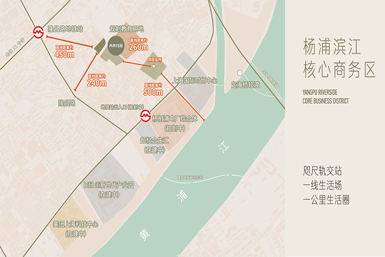 项目距轨交12号线隆昌路站约500米,规划24号线合生汇站约300米,实现双轨交覆盖。12号线4站直达北外滩,7站陆家嘴,8站人民广场,可换乘13条线路。紧邻北横通道、中环和内环等高架路网,周边杨浦大桥、军工路隧道、江浦路隧道环绕,快速通达全市。